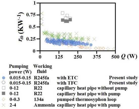 The development of Rth correlation followed the procedures implanted in Equations (13)–(23). Justified by the linearity of Rth variations along with Rth,con in Figure 6a,b, the Rth correlations for the loops with TFC and ETC were formulated as Equation (24).