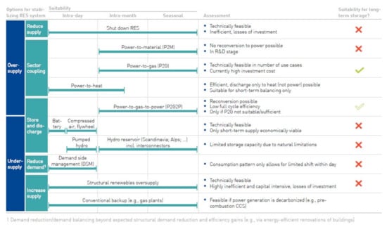 The new and emerging EU energy system uses modern and innovative techniques for grid balancing. The first approach for the new grid balancing method is a combination of coupling different sectors and an interconnection of the building heating and cooling demand, the transport and industrial sector as energy consumers with power generation. Such an approach provides a higher stability to the renewable energy system [20]. The second approach for grid stabilization and balancing is the application of long-term storage/discharge technologies. The third approach is the transportation of energy from centers of supply to centers of demand, using also smart grid techniques. The first approach enables balanced demand between different sectors, the second one provides grid balancing directly through the storage/discharge units of renewable power, while the third approach can be combined with the other two, in order to come up with a stabilized, efficient, and environmentally friendly EU energy system.
