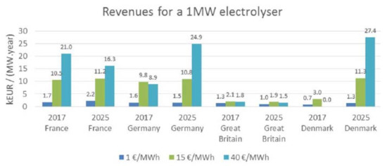 - Guinot, B.; Montignac, F.; Champel, B.; Vannucci, D. Profitability of an electrolysis based hydrogen production plant providing grid balancing services. Int. J. Hydrogen Energy 2015, 40, 8778–8787. [Google Scholar] [CrossRef]