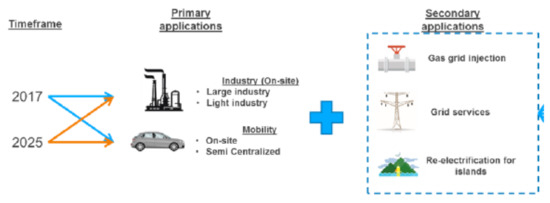 - Grid services provision: This market option should be handled as a secondary value stream to build successful and profitable business cases. It is evident that the provision of grid services (balancing services, load frequency control, and distribution grid services) for hydrogen producers through water electrolysis should be combined with at least one other business case/application of hydrogen, such as power to mobility, power to industry, or power to gas. Such an approach would result in creating a more attractive and profitable business case for hydrogen producers.