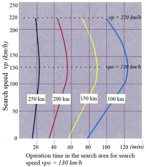 Dependence of the operation time in the search area depending on the search speed vpo achieved by the helicopter; optimal search speed is vpo = 130 km/h, constant cruising speed of the helicopter vp = 220 km/h and the set of search radius rp = (100, 150, 200, 250 km).
