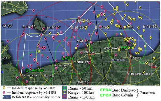 The data in Table 5 and Table 6 were obtained on the basis of the analysis of reports on rescue flights performed by the Mi-14 PS and W-3 RM helicopters, which are presented in Figure 4. The graph shows the dependence of the operation time in the search area on the search speed achieved by the helicopter, the optimal search speed is vpo = 130 km/h, the constant cruising speed of the helicopter is vp = 220 km/h, and the search radius set rp = (100, 150, 200, 250 km). Rescue flights were performed from the Gdynia bases (EPOK) and the Darłowo base (EPDA). The locations of the performed rescue missions are shown in Figure 5.
