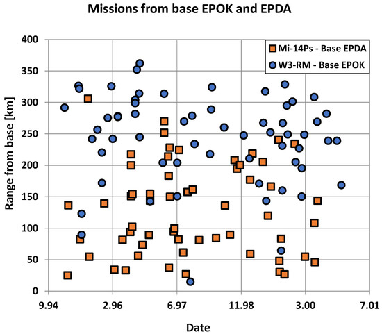 Distance distribution for missions that started from EPOK and EPDA bases in 1995–2001; W3-RM and Mi-13PS helicopters were used.
