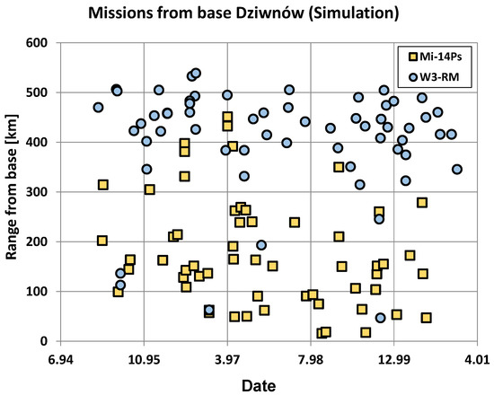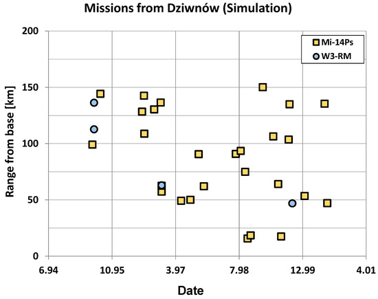 Range from base for simulated missions which started from Dziwnów base in years 1995–2001; W3-RM and Mi-13PS helicopters were used.