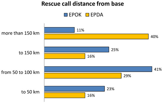 Figure 6 shows the distance from the base of rescue missions launched at the EPDA base in the years 1995–2001, with the use of Mi-14PS helicopters. Figure 6 shows the distance from the base of rescue missions launched in the EPOK base in the years 1995–2001, with the use of W3-RM helicopters.