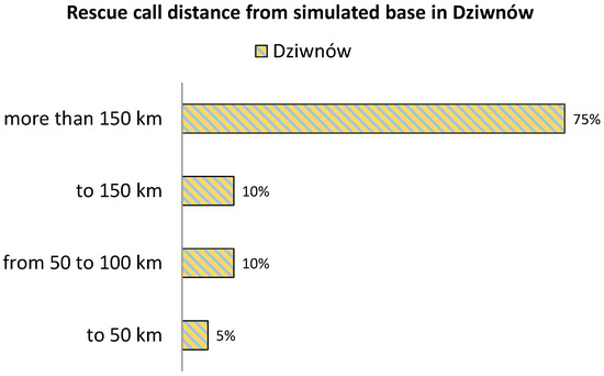 Figure 9 shows the percentage distribution of missions depending on the distance from the starting base. It was observed that 40% of the missions launched at the EPDA base were carried out at a point more than 150 km from the base. It can be concluded that there is a location of a potential third base from which the distance to these points would be smaller. Figure 10 shows simulations of the distance distribution of the rescue flight target for missions starting at the base located in Dziwnów; 25% of the mission objective points are within the operating radius of 150 km.