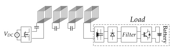 In recent years, wireless power transfer (WPT) has received increasing attention for the prospects of use that it offers, ranging from powering portable electronic devices to electric vehicle (EV) charging. The WPT systems are continuously improved, allowing more power to be transferred and operation in difficult environment, where water, dirt or dust are present. The major limitations for inductive power transfer (IPT) technologies are the magnetic field generated that can cause disturbances to electric and/or electronic devices and field exposure to people in the surroundings as well as the transmission distance, which is limited by the nature of the physical phenomena exploited. As a consequence, these issues have become the most important challenges in this field and different solutions have been proposed in the literature [1,2,3,4,5]. It is indeed necessary to consider both problems when realizing WPT devices. High-frequency IPT systems are usually the most popular candidates, allowing the size of the components to be limited with an acceptable transmission distance, even if the electromagnetic radiation may become hazardous as the frequency increases. For this reason, they can be sized for a limited amount of power, resulting in WPT systems suitable for portable electronics or medical devices only [6,7]. Another widespread alternative is represented by the possibility of inserting relay coils between the transmitting and receiving circuits, thereby forming a structure of magnetically coupled resonators as shown in Figure 1. In this case, the power rating of the apparatus is determined by the size of the coils and related components, which can be tailored also for high power transfer, as it is needed in industry or EV charging applications. There are many papers that testify the potential of relay coils, arranged in widely differing ways, as reported in [5,8,9,10,11,12,13,14], even if a conventional structure and arrangement of the coils is not discussed.