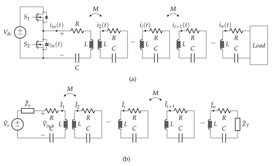 Equivalent circuits of a resonator array (a) circuit fed by a half-bridge inverter and connected to a load and (b) approximate circuit for the first harmonic.