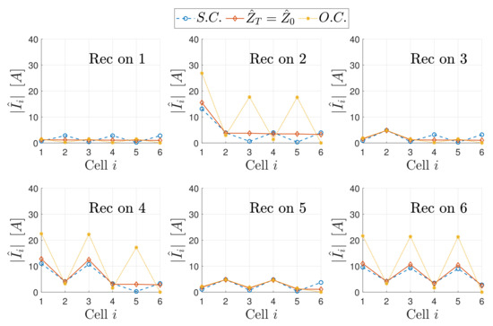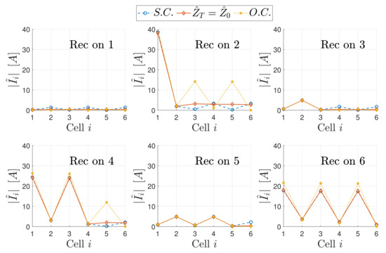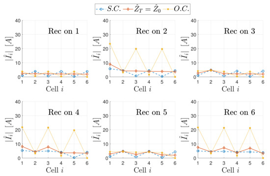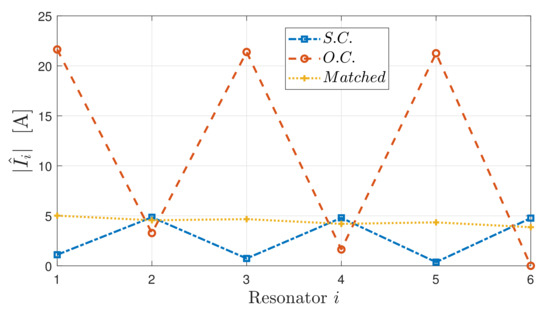 The procedure just illustrated allows the calculation of the currents in the resonators of the array and the determination of the overall standing wave pattern. Performing the calculation for different values of the reflection coefficients and , it is possible to observe different configurations for the MI wave. The simulations have been carried out with reference to the real system used in the experiments, whose parameters are summarized in Table 1. The apparatus can be used for industrial applications (automatic machine and electric vehicle charging) to transmit power up to a few kWs. Thus, a H-bridge inverter has been chosen as power source, which operates in the range of hundreds of kHz. The inverter feeding the apparatus is realized with GaN transistors, with an internal impedance , which results in a source reflection coefficient (perfect reflection). The termination reflection coefficient depends on the termination load and its effect has been investigated in [23], with a great, but unique, focus on the efficiency and power transferred. In Figure 4, the standing wave pattern for the current is plotted in the case of short-circuit (S.C.) termination, open-circuit (O.C.) termination and perfect load matching. As expected, the matching termination avoids the standing wave from arising, whereas the current peaks are much more significant in case of O.C. termination. It is interesting to notice that, as the considered TL is an array of resonators, the O.C. termination corresponds to an array with one resonator less. This peculiarity is crucial for the following analysis.