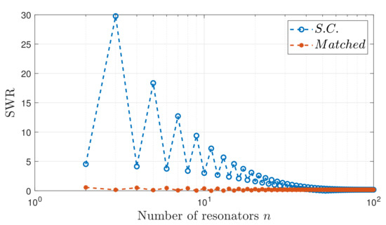 Resorting to the definition reported in (17), it is possible to evaluate the current SWR for arrays of different lengths, namely for arrays formed by a different number of resonators, as shown in Figure 5. In particular, the blue curve refers to arrays with S.C. termination, whereas the red one is obtained with a perfect matching. The case of O.C. termination is not shown, as it corresponds to an array shorter than one cell with S.C. termination. As expected, with a matched termination the SWR is always closed to one and the magnitude of the current is equal for each resonator, with relatively moderate values with respect to the case in which standing waves are present.
