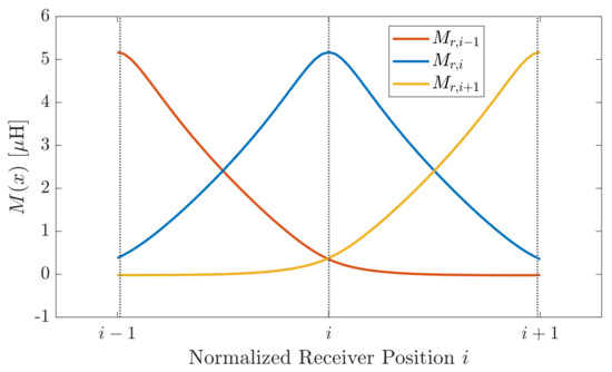 Until now, resonator arrays have been considered to enhance the power transmission to the terminal resonator, which acts as a receiver for the WPT system. However, in the literature, a slightly different application is usually considered, that exploits the whole array as a transmitter, over which the receiver is free to move. This configuration increases the tolerance to the misalignment of the receiver circuit and represents a suitable solution for industry applications, e.g., for automation and EV charging. Furthermore, if the receiver moves over the resonators, it could offer the possibility of a dynamic power transfer. In this section, the configuration of a resonator array with a receiver shown in Figure 6 is analysed, making use of the approaches presented in Section 2 and highlighting its equivalent TL. Basically, the array is the same presented in Section 3, with a further resonator labelled r acting as a receiver, which for simplicity is identical to the array resonators and is placed 10 mm above the array. The load is connected to that resonator and is its impedance, as represented in Figure 7. The last cell of the array is terminated in an additional impedance that can assume arbitrary values. There is now another parameter that affects the operation of the WPT system, which is the mutual inductance between the receiver circuit and the i-th resonator of the array facing the receiver. It depends on the geometry of the cells and the position x of the receiver along the array, which is described by the coordinate system represented in Figure 6. As all the resonators are identical, the mutual inductance, function of the position x, behaves as reported in Figure 8 for the receiver and three different consecutive resonators.