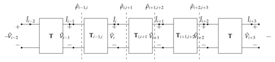 The equivalent TL representing this system configuration can be obtained from that of the resonator array without a receiver considering the increased impedance of the ith resonator. The transmission matrices and representing the coupling between the ith resonator and the adjacent ones ( and , respectively) modify consequently, as in (4) becomes , while the mutual impedance is not altered. By using (10), the segment of MI waveguide composed of the two-port networks represented by the modified transmission matrices and presents a characteristic impedance . Thus, at the interfaces between TL segments of different characteristic impedances, shown in Figure 9 by vertical dashed lines, there occur reflections of MI waves that come from the power source and the termination. The reflection phenomenon can be understood by means of the reflection coefficient at the interfaces. For forward MI waves travelling from the power source towards the termination (positive x direction), the reflection coefficient at the interface between the and i cells is