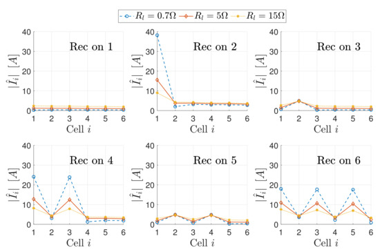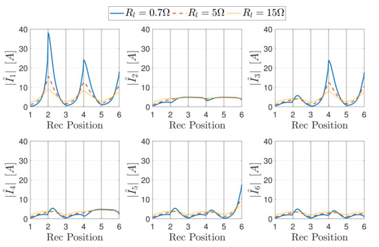 In Figure 11 the current magnitudes of the resonators are reported as a function of the receiver position for different values of the load resistance. The plots suggest the presence of standing wave patterns for the MI waves and indicate that the most severe current peaks occur when the receiver is perfectly aligned with a resonator. For a better visualization of the standing wave patterns, the resonator current magnitudes are plotted for different values of the load resistance in Figure 12, considering only the position of perfect alignment since it leads to the highest current magnitudes. As it can be expected, no standing waves occur for the segment of the TL after the resonator covered by the receiver, with the overt case when the receiver is placed over the first resonator of the array. The reflections caused by the impedance discontinuity are more evident when the receiver is close to the power source, since this situation corresponds to the shortest equivalent TL, confirming what discussed in Section 4.1 and observed in Figure 5.