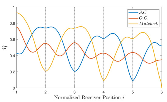 The standing wave patterns of the efficiency, shown in Figure 13, suggest the possibility of adjusting the termination impedance of the array so that an efficiency peak is obtained at the position of the receiver. Among the proposed modulation techniques [27,28], the simplest idea consists in changing the termination condition from S.C. to O.C., leading to a shift in the standing wave pattern of the current with a consequent shift in the position of the efficiency peaks.