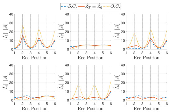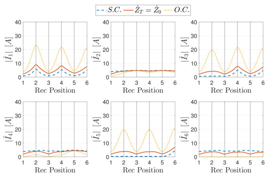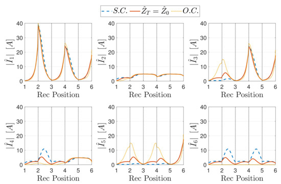 The magnitude of the resonator currents as a function of the receiver position and the relevant standing wave patterns for a perfectly aligned receiver are plotted in Figure 14, Figure 15, Figure 16, Figure 17, Figure 18 and Figure 19 in the case of S.C., O.C. and perfectly matched termination for different receiver load values. In particular, Figure 14 and Figure 15 refer to , Figure 16 and Figure 17 to and Figure 18 and Figure 19 to .