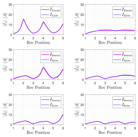 The numerical results have been experimentally verified considering the array represented in Figure 6, in the case of perfect matching of the termination and a load of 5 . In Figure 6 all the components of the experimental system are indicated. The array prototype, shown in Figure 20, is composed of six stranded-wire resonators (coils), each made with six square turns of 153 mm side-length. The winding conductors have a section of 2.5 mm, resulting in an intrinsic resistance and a self-inductance H. The terminals of each resonator are connected to a capacitor of capacitance nF, so that the coils resonate at a frequency kHz. This array is characterized by a mutual inductance H between adjacent resonators, resulting in a characteristic impedance . The input voltage downstream of the supply system is set to and is provided by a half-bridge inverter realized with GaN transistors, with an internal impedance . The currents have been measured by means of a current probe Tektronix TCP302 amplified by a Tektronix “TCPA 300” and processed through an Agilent “Infiniium” 54855A oscilloscope with a sampling capability of 2 GSa/s and a bandwidth of 500 MHz. The measurements refer to the current magnitude of each resonator versus the position of the receiver along the array, considering the array terminated in a resistance of 1.5 and the receiver connected to a 5 resistive load. The results of the measurements are reported in Figure 21 and are compared with the numerical predictions (see Figure 11 and Figure 16). As expected, the measurement reveals the presence of standing wave patters for the MI wave (current wave), with the highest magnitude values in correspondence to the positions of perfect alignment of the receiver with even resonators. The comparison between measurements and numerical simulations shows a very good agreement; the maximum difference between the trends is found in correspondence of the current peak values, with an error of about 3.5%.