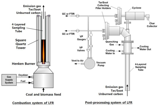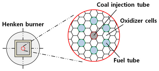 The experiments were performed in an LFR system designed and fabricated by Pusan Clean Coal Center (PC3) in the Pusan National University [17]. An LFR is a device that can simulate a PCI system environment in a BF in terms of high temperature and rate of temperature increase. Figure 1 shows a schematic of the LFR. The LFR system comprises three parts: a Henken burner, square quart tower, and sampling probe. The Henken burner is responsible for forming the combustion environment for coal particles by generating a flat flame with a high heating rate and temperature. Stainless steel tubes (i.d. = 0.6 mm) were installed within the hexagonal honeycomb cell matrix, as shown in Figure 2. These tubes were used to supply gas fuel such as CO and H2. A coal-based feeding tube was installed at the center of the Henken burner. Other void honeycomb cells were used for oxidizer channels for N2 and O2. The LFR burner generates diffusion flat flame with an oxygen concentration of 26% and a flame temperature of ~2000–2250 K at a heating rate of 105 K/s. Coal particles were injected on the diffusion flat flame formed on the top surface of the burner. A square quartz tower acted as the reactor, thus allowing for the observation of the burning coal particle flame, measurement of the burning coal particle temperature using a two-color pyrometer, and prevention of surrounding air intrusion. At the top of the quartz tower where the sample trapping probe was installed, tar/soot and char samples could be collected. The probe could be shifted up and down to set the residence time.