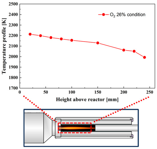 CO, H2, N2, and O2 gases were supplied to make a flat flame for the combustion of coal particles. CO, H2, O2, and N2 gas flows were 9.0, 0.4, 9.1, and 3.9 slm, respectively. To create a similar combustion environment within the PCI in the BF, an oxygen concentration of 26% and a flame temperature of 2000 K were applied. The gas temperature in the reactor was measured using an R-type thermocouple with a bead diameter of 0.3 mm. Then, the measured gas temperature was corrected for radiative loss. The temperature of the produced flame was measured from a distance of 20–240 mm from the burner’s bottom in 20 mm sized intervals. Figure 4 shows the measured flame temperature distribution results along the centerline of the reactor. The measurements were performed without feeding the fuel particles.