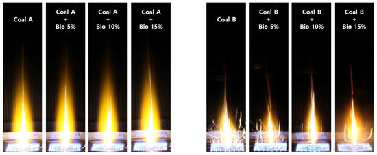 As shown in Figure 5, the coal and biomass blending fuel particle flame images were measured by a Canon 600D digital camera during combustion. When fuel particles were exposed to high-temperature flames, the coal combustion started; each coal type has a different flame structure depending on its characteristics. The volatile matter was released after it was burned at the initial stage: a large volume of volatile materials was emitted with the rapid heating of fuel particles. The volatile matter cloud was approximately four times as large as the particle size [17]. The gas temperature and combustion efficiency within the BF were mostly affected by the volatile matter content of the coal [21]. In the volatile combustion region, the combustion of the volatile matter begins at the burner surface and ends when the volatile matter cloud is at its widest. The volatile matter content determines the length, thickness, and brightness of the volatile matter cloud. Coal A exhibited an ordinary coal flame structure and a high volatile matter content, thus showing a wide and long, volatile matter cloud. However, when the Coal B particle was injected into the burner, the coal particle broke into small particles, thus resulting in small-particle combustion, which is known as the “fragmentation phenomenon”. Coal A had enough volatile matter content (40.27%); however, it was difficult to observe the volatile matter cloud for Coal B because of the fragmentation phenomenon. Generally, high-volatile and low-fixed-carbon coal produces a shorter overall flame than low-volatile and high fixed-carbon coal. However, although Coal B exhibits a low volatility and a high, fixed carbon content, it shows a similar flame length as Coal A because of the fragmentation effect. The fragmentation phenomenon produced smaller particles and affected the combustion rate; therefore, devolatilization occurred in a short time period, and the char oxidation process occurred at an early stage. As per Pohlmann et al. [22], the fragmentation phenomenon results in a decrease in the particle size in the early stage of the heterogeneous ignition and results in strong luminescence of the coal particles, along with a high combustion rate.