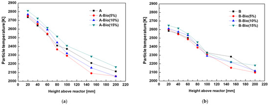 Figure 6 shows the results for the particle temperature distribution along the height above the reactor. Although the difference in the particle temperature between coal and coal with biomass blending is small, the particle temperature was >50 K at a certain height above the reactor when the biomass blending ratios increased. At the initial stage, the order of the particle temperature in Coal A was A-Bio (15%) > A-Bio (10%) > A-Bio (5%) > A, while that in Coal B was B-bio (15%) > B-Bio (10%) > B-Bio (5%) > B. Using these results, we can understand that the volatile matter content is an important factor in the initial stage of coal combustion. The temperature drop between the initial stage of coal combustion and final stage is larger in Coal A than Coal B. The particle temperature decreased by ~700 K in Coal A and its blending case. However, in Coal B and its blending case, the temperature only decreased by ~500 K. This comparatively low decrease is attributed to the fragmentation phenomenon. Small particles were produced from the fragmentation, thus providing an advantage for the combustion behavior. The particle–temperature distribution tendency changes between 80 and 100 mm above the reactor. In most of the biomass blending cases, a lower particle temperature than those for Coal A and Coal B is exhibited.