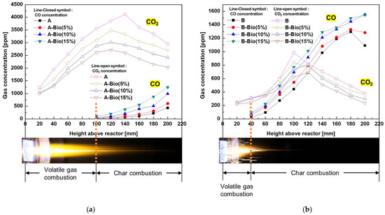 CO/CO2 emission gas concentration distribution along the height above the reactor: (a) Coal A + biomass (0%, 5%, 10%, 15%) and (b) Coal B + biomass (0%, 5%, 10%, 15%).