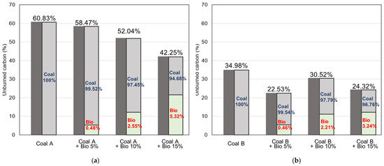 Unburned carbon ratio and the ratio of coal to biomass in unburned carbon (a) Coal A + biomass (0%, 5%, 10%, 15%) and (b) Coal B + biomass (0%, 5%, 10%, 15%) (The proportions of the coal–biomass shown in the plot were rescaled to show the tendency).