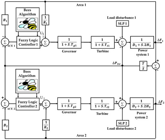 In view of the above, this work proposes a design of a Fuzzy PID with a derivative filter action (Fuzzy PIDF) employed for the LFC in an unequal two-area interconnected thermal power system. Moreover, as the classical methods, including hit and trail, used to determine the optimum values of the scaling factor gains of fuzzy PIDF are time-consuming and may not provide desirable solutions, the parameters of the proposed controller are optimized by an algorithm called the Bees Algorithm (BA), which has demonstrated a successful implementation in diverse optimization problems [,,,]. TLBO and PSO are also used in this work for the same purpose. The aim of the work presented in this paper can be summarized as follows: (i) to propose a Fuzzy PIDF optimized by the BA and other two algorithms for load frequency control of a two-area power system and to investigate its dynamic performance; (ii) to assess the supremacy of the proposed technique by comparing the results with those of previously published works based on TLBO tuned Fuzzy PID [] and Lozi map-based Chaotic Optimization Algorithm (LCOA) tuned PID []; and (iii) to investigate the robustness of the Fuzzy PIDF against a wide variation range in the parametric uncertainties of the investigated system.