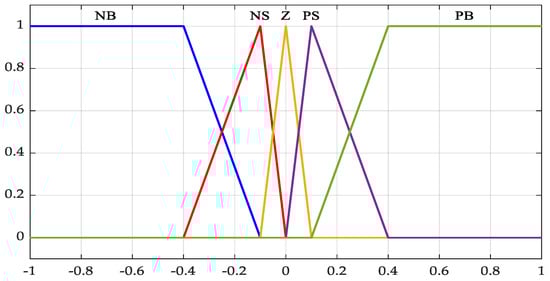 The structural design of the proposed controller equipped in area one is explained in Figure 2. As is evident from the figure, the controller has two inputs,  and the derivative of , and one output. In this structure,  and  are the scaling factor gains of the input. While , , and  which is the filter gain, are the scaling factors of the output. A similar controller is also employed in area two with  and  as the input scaling factors and , , and  for the output scaling gains. Accordingly, twelve parameters are to be optimized to obtain the desired dynamic response of the investigated system. Because of its simplicity and because less computation time is needed for this sort of membership, three triangular/two trapezoidal membership functions are utilized for the inputs and the output variables, as demonstrated in Figure 3, namely Negative Big (NB), Negative Small (NS), Zero (Z), Positive Small (PS), and Positive Big (PB). Therefore, as depicted in Table 2, twenty-five rule bases are required to generate the fuzzy output of the controller. As the controller’s performance depends on these rules, the tabulated rules are obtained by a comprehensive study of the investigated power system’s dynamic behaviour. Furthermore, the “Mamdani” interface method is utilized in this design for the fuzzification stage, while the “Centroid” tool is utilized for the defuzzification stage. Identical membership and rule base are utilised to design the Fuzzy PIDF employed in area two.