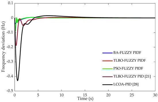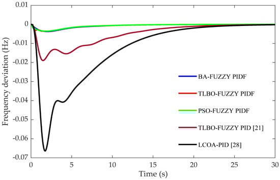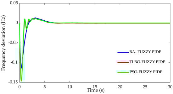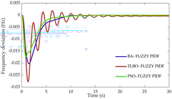 Figure 5, Figure 6 and Figure 7 summarize the main outcomes of the proposed Fuzzy PIDF, where it is obviously remarked that this controller offered the best response among the investigated methods. Furthermore, despite the clear similarity in the dynamic response obtained by the proposed fuzzy structure tuned by BA, TLBO, and PSO, it is observed that the BA optimized the proposed fuzzy controller and provided the best result in terms of the drop in the frequency represented by the peak undershoot occurring in area one after the 0.2 pu disturbance enforcement. However, the Fuzzy PIDF tuned by the TLBO and PSO offered the best drop in frequency in area two. The dynamic performance of the system based on the Fuzzy PIDF tuned by the suggested algorithms, the Fuzzy PID optimized by TLBO, and the PID controller tuned by LCOA, represented by undershoot, peak overshoot, and settling time in , , and , is illustrated in Table 6; the value of the objective function based on each technique is also given.