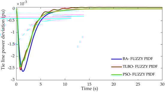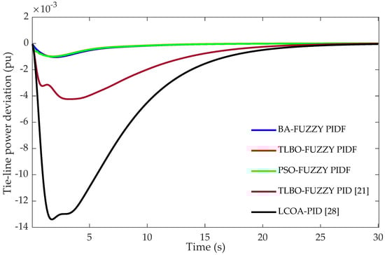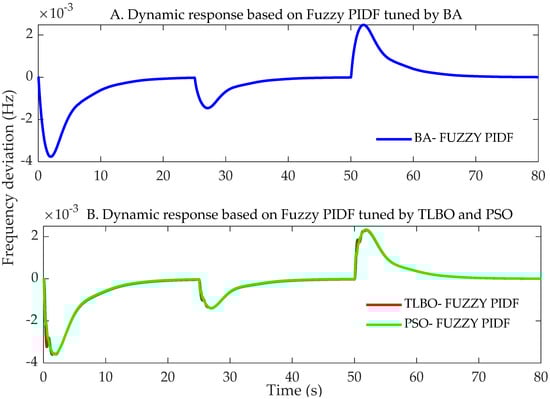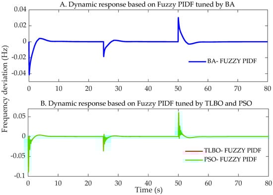 In order to examine the robustness of the Fuzzy PIDF towards the parametric uncertainties of the controlled system, several parameters of the investigated testbed system are simultaneously altered from their nominal values. The parameters Tg, Tt, and H in both areas are varied by +50%, while the parameters B and D are varied by −50%. A step load perturbation of 0.2 pu is suddenly applied (at time t = 0 s) in area one and the optimal gains of the Fuzzy PIDF obtained in the normal condition are not to be re-tuned to verify the robustness of the proposed controller. Figure 9, Figure 10 and Figure 11 and Table 7 show the dynamic performance of the two-area power system as it is exposed to a parametric deviation test with the recommended Fuzzy PIDF-based BA, TLBO, and PSO employed for LFC.
