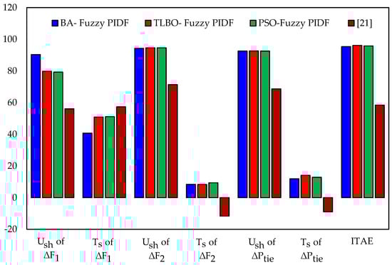 Table 6 gives further verification of the superiority of the suggested controller over those presented in previous studies. The percentage of improvement in the undershoot (), settling time (), and the ITAE for the Fuzzy configuration optimized by different algorithms and the Fuzzy PID proposed in [], in comparison with the LCOA-based PID controller [], is shown in Figure 8 (this figure is obtained by analyzing the characteristics provided in Table 6). From Figure 8, it is noted that with the proposed Fuzzy PIDF controller optimized by the suggested algorithms, the overall performance of the system has witnessed a remarkable improvement.