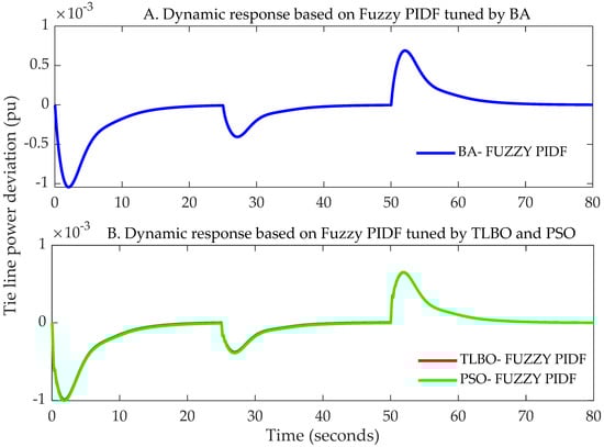 Tie-line power deviation ( in pu): (A) based on BA tuning and (B) based on TLBO and PSO tuning.
