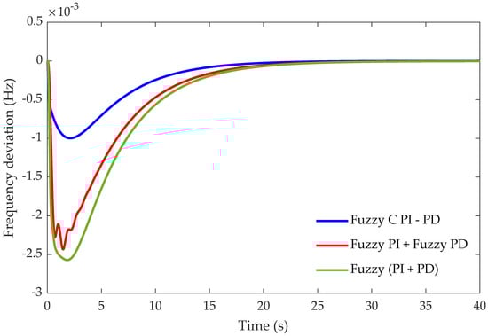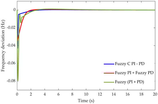 Figure 26 indicates the dynamic response of the system under parametric uncertainty case 5. In this case, the frequency bias in both areas is altered by +50%. It is noticed that the increase in frequency bias has marginally improved the dynamic response in terms of the drop in the frequency, where the maximum undershoot of the frequency in area one () has decreased from −0.0431 Hz, −0.0346 Hz, and −0.0792 Hz to −0.0377 Hz, −0.0307 Hz, and −0.0693 Hz, while the drop of the frequency in area two () declined from −0.00099 Hz, −0.0024 Hz, and −0.0026 Hz to −0.00054 Hz, −0.0013 Hz, and −0.0014 Hz, based on Fuzzy C PI − PD, Fuzzy PI plus Fuzzy PD, and Fuzzy PI + PD, respectively. With regard to the influence of decreasing the frequency bias on the stability of the power systems which are considered in case 6 and illustrated in Figure 27, it is obvious that the decrease in the frequency bias has slightly worsened the dynamic response of the system in terms of the frequency variation, where it is noted that the maximum undershoot of the frequency in area one has increased from −0.0431 Hz, −0.0346 Hz, and −0.0792 Hz to −0.0577 Hz, −0.0546 Hz, and −0.1029 Hz, while the drop of the frequency in area two () increased from −0.00099 Hz, −0.0024 Hz, and −0.0026 Hz to −0.0028 Hz, −0.0080 Hz, and −0.0074 Hz, based on Fuzzy C PI − PD, Fuzzy PI plus Fuzzy PD, and Fuzzy PI + PD, respectively.