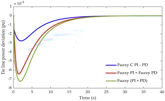 The uncertainty in the governor time constant (Tg) has a similar impact of uncertainty as the turbine time constant on the stability of the system in terms of frequency variation and the speed of the response. Figure 30 reveals the dynamic performance of the dual-area power system when the proposed fuzzy structures are employed as LFCs in the system with the consideration of parametric uncertainty case 9, where the governor time constants in both areas are varied by +50% from their nominal values. As a result of uncertainty in the governor time constants within the system, the drop in the frequency in area one () has incremented from −0.0431 Hz, −0.0346 Hz, and −0.0792 Hz to −0.0573 Hz, −0.0468 Hz, and −0.1038 Hz, while the drop in the frequency in area two () increased from −0.00099 Hz, −0.0024 Hz, and −0.0026 Hz to −0.0012 Hz, −0.0035 Hz, and −0.0037 Hz, based on Fuzzy C PI − PD, Fuzzy PI + PD, and Fuzzy PI plus Fuzzy PD, respectively. Moreover, the settling time of  decreased from 2.1873 s, 7.0632 s, and 2.1384 s to 1.724 s, 5.788 s, and 1.7013 s, based on Fuzzy C PI − PD, Fuzzy PI plus Fuzzy PD, and Fuzzy PI + PD, respectively. The dynamic response of the system under parametric uncertainty case 10 is illustrated in Figure 31. In this case of robustness analysis, the governor time constants in both areas are varied by −50% from their nominal values. The results obtained based on case 10 revealed that the decrease in the governor time constant results in a clear decrease in the frequency variation and tie-line power deviation.