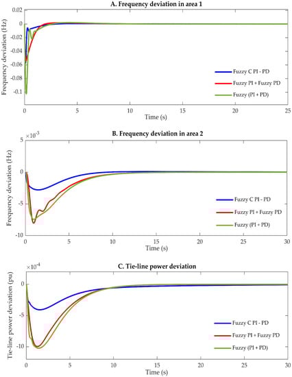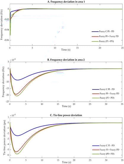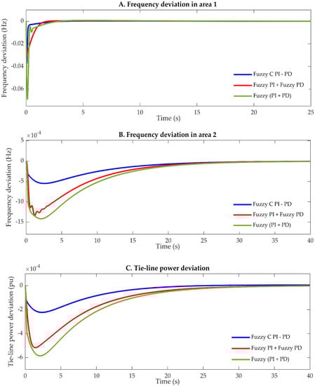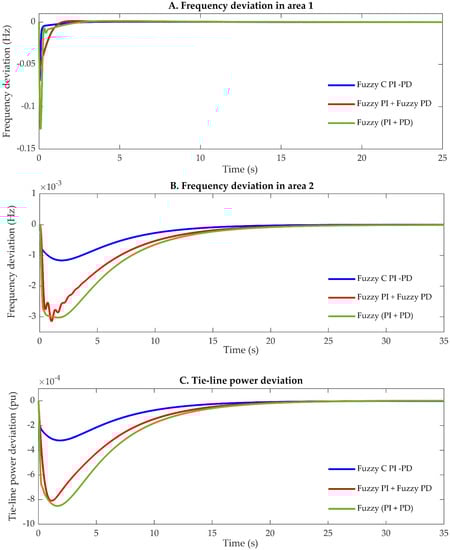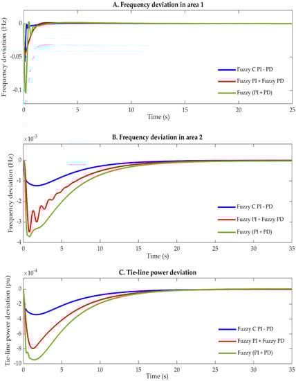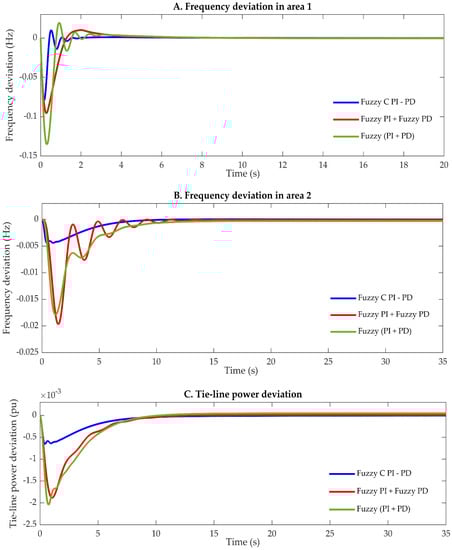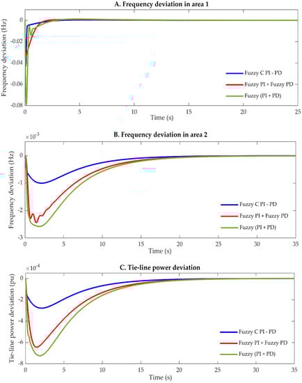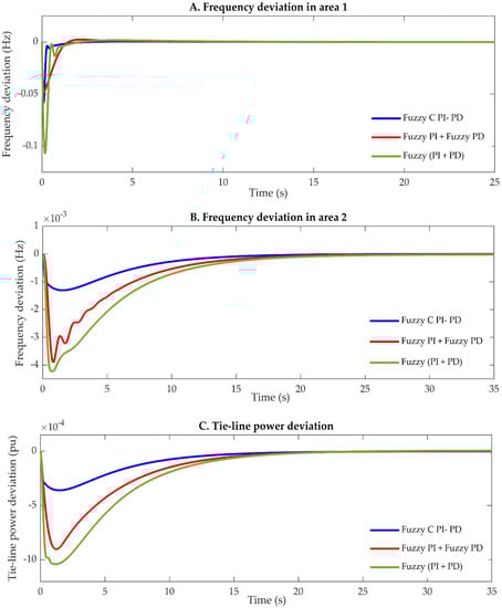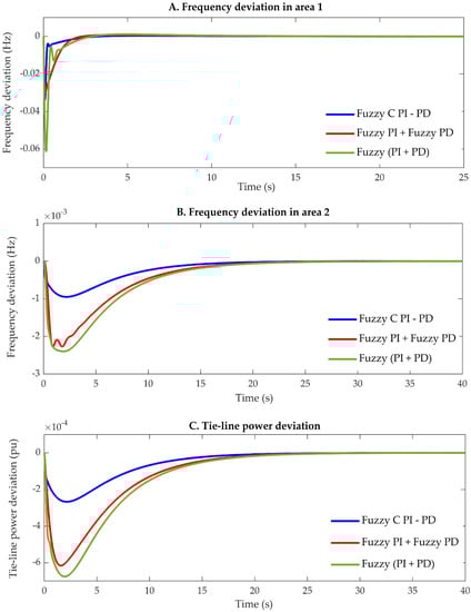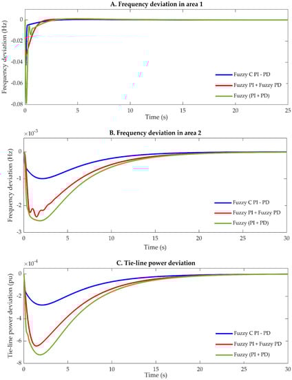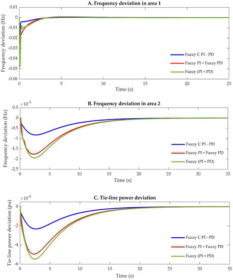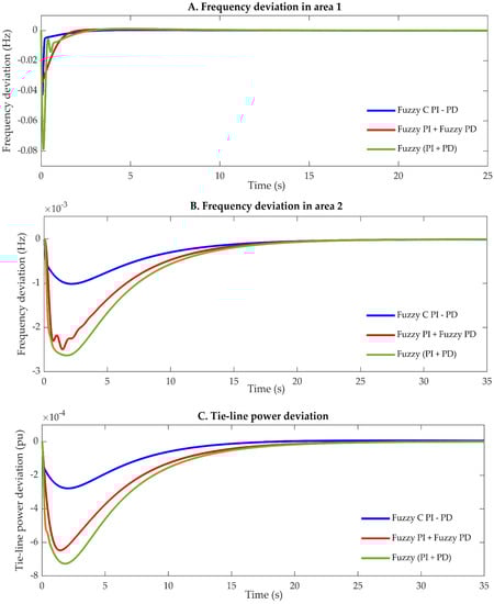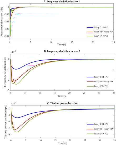 The impact of uncertainty in the turbine time constant is investigated in case 3 and case 4. Figure 24 demonstrates the dynamic performance of the testbed system based on the proposed fuzzy configurations under parametric uncertainty case 3, where the turbine time constants in both areas are varied by +50% from their nominal values. From Figure 24 and Table 12, it is noticed that as a consequence of increasing the turbine time constants within the system, the drop in the frequency in area one () has jumped from −0.0431 Hz, −0.0346 Hz, and −0.0792 Hz to −0.0585 Hz, −0.0486 Hz, and −0.1074 Hz. While the drop of the frequency in area two () increased from −0.00099 Hz, −0.0024 Hz, and −0.0026 Hz to −0.0013 Hz, −0.0039 Hz, and −0.0042 Hz, based on Fuzzy C PI − PD, Fuzzy PI plus Fuzzy PD, and Fuzzy PI + PD, respectively. It is also obvious that due to the increase of the turbine time constant, the settling time of the , , and  has slightly decreased. In contrast, from Figure 25, the decline in the turbine time constant brings about a decrease in the frequency deviation and slightly slows the system.
