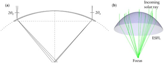 (a) Cross-sectional representation of an elliptical-shaped Fresnel lens (ESFL). 2θa represents the subtended angle of the Sun to the Earth and 2θE the solar–terrestrial angle after the passage of the solar rays through the atmosphere. (b) 3D representation of the ESFL.