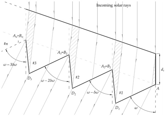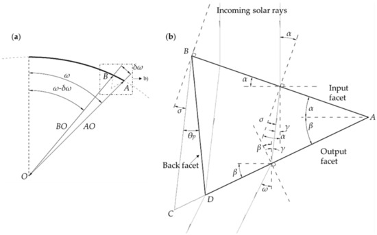 The prisms were modeled through Equation (3), based on Snell’s law, starting with the outmost one, as indicated in Figure 3a. Each prism is defined by three facets: the input, output and back facets, represented in Figure 3b. The input facet is defined by the segment between point A and point B. α represents the angle between the vertical line (solar ray path), with the normal line of the input facet AB. The solar ray is refracted as it hits AB. Depending on the refractive index of the medium (nλ), the ray is deviated by an angle γ. It is then shifted further as its leaves the output facet of the prism, making an angle of ω in relation to the vertical axis. The output facet is either defined by the segment AC or AD depending on the pitch angle. In this paper, the refractive index nλ of poly (methyl methacrylate) (PMMA) material (nλ = 1.492) was considered.