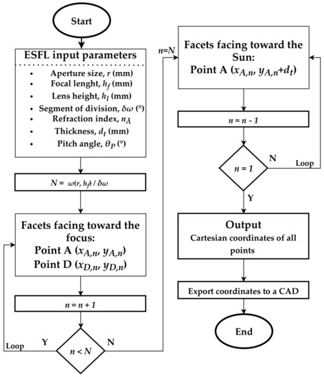 Finally, a single prism can be drafted with Equations (7), (8) and (16), forming a triangle of points ABD. The grooves of the ESFL’s output surface were the first components to be modeled by drawing all the facets from coordinates An and Dn, starting from the outmost prism (n = 1) to the innermost prism N. This chaining process followed a sequence of A1D1A2D2 … ANDN. The input surface of the ESFL was then drawn from the last prism (Nth prism) to the first one, i.e., N to n = 1, with the Y coordinate offset by an increment of dt, the thickness of the concentrator from point AN. Hence, the coordinates of point AN take the form of (xA,N, yA,N + dt). The output drawing is shown in Figure 4, and the procedural chaining process is summarized in a flowchart, as presented in Figure 5.