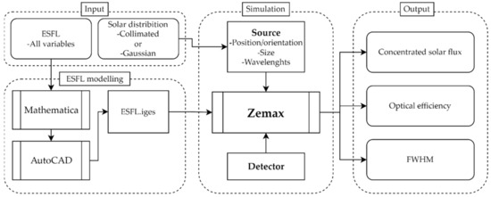 Figure 6 shows the sequence of the numerical simulation process. The sequence was the same for each ESFL configuration, but each output was unique in terms of concentrated solar flux, optical efficiency and focal size at FWHM.
