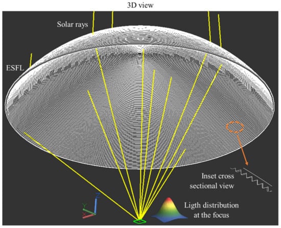 To overcome the aberration chromatic issue of Fresnel lens concentrators, a novel parametric model of a three-dimensional elliptical-shaped Fresnel lens was provided and analyzed. The modeling process took into account the solar Gaussian distribution based on the measured parameters by Vittitoe and Biggs [35], instead of the classical edge-ray principle method and the solar acceptance half-angle of 0.27°. The design was performed by CAD software and then imported into Zemax for numerical calculations. The accuracy of this model was confirmed by the numerical analysis of the output performance of a flat Fresnel, whose results matched well with the experimental data [36]. The ESFL output performance was compared to these results, under the same focusing conditions, revealing the advantage of the ESFL in focusing more efficiently the solar rays from the external annulus area, at the external annulus collection area, where a significant part of the incoming solar power is collected, resulting in a significant increase in the concentrated solar flux.