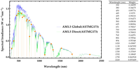 Global and direct solar spectra ASTMG173 at AM1.5, with the selected wavelength used for ray tracing in Zemax and its respective weight value.