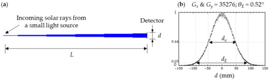 θE can also be found in Zemax by using a detector at a certain distance from a small solar light source, as shown in Figure 9a. The length L is set as 10 m from the source of 0.002 mm diameter, and the size of the detector (d) as 150 × 150 mm2 with a precision of 1001 × 1001 pixels. The calculation of θE is independent of the distance L since dE is adjusted by the inverse-square law.