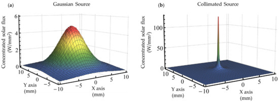 Alternatively, the Gaussian distribution of Gx and Gy can be manually adjusted in Zemax based on experimental measurements. For example, in a numerical study of a three-dimensional ring-array concentrator [28], where its output performance was compared to that of the medium sized solar furnace (MSSF) concentrator of PROMES-CNRS (Procédés Matériaux et Energie Solaire—Centre National de la Recherche Scientifique) [38], Gx = Gy = 36,000 was considered [28]. In this case, the solar distribution at the focal zone of the MSSF concentrator had the same characteristics as those described by [38,39,40].