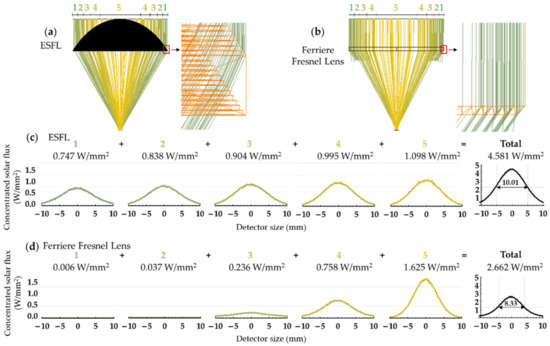 (a) The ESFL and (b) the Ferriere Fresnel lens irradiated by five concentric solar sources with identical area and power. (c,d) Respective concentrated solar fluxes for the ESFL and the Ferriere lens, respectively; the combined solar fluxes are also given.