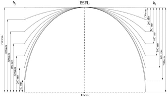 The ESFL has a similar configuration of a flat Fresnel lens at hf = 700 mm, hl = 0 mm. As hl increases, the lens becomes more curved, and the aspect ratio becomes larger. The aspect ratio (AR) of the ESFL is given by the quotient of hl and D (diameter of the lens):