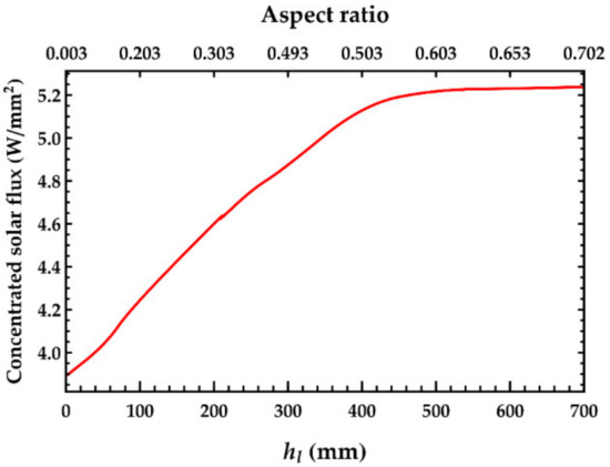 Each hf has its own peak concentrated solar flux at different hl (Figure 14a). For example, in the ESFL configuration with hf = 200 mm, the concentrated solar flux varies from 4.2 W/mm2 at hl = 50 mm to 5.2 W/mm2 at hl = 500 mm, above which it starts to decrease. The highest concentrated solar flux was attained by the lowest hf = 200 mm at hl = 500 mm (aspect ratio of 0.603). The increase in hf resulted in a lower concentrated solar flux, whose peak value shifted to a lower hl, decreasing the aspect ratio of the concentrator. For example, the ESFL with hf = 600 mm has an aspect ratio of 0.500 with hl = 350 mm and a concentrated solar flux of 4.4 W/mm2.