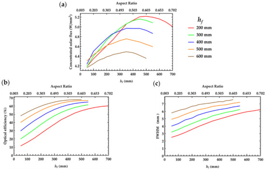 (a) Concentrated solar flux, (b) optical efficiency and (c) FWHM of the ESFL configurations with D = 1 m at various hf and hl combinations.