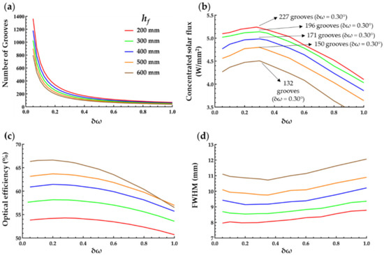 Figure 15b shows the concentrated solar flux as a function of δω. Regardless of hf, the maximum concentrated solar flux was found at δω = 0.3°, which is equivalent to 210 to 132 grooves for hf 200 mm to 600 mm, respectively. As shown in Figure 15c, the increase in δω lowers the optical efficiency from 66% to 56% and 53% to 50% at hf of 600 mm and 200 mm, respectively. The FWHM shows a minimum within a certain δω range, as shown in Figure 15d. For example, at hf = 600 mm, more than 10.7 mm FWHM was found at δω = 0.35°, while at hf = 200 mm, the minimum FWHM of about 8 mm was found at δω = 0.2°. In all cases, the largest FWHM is located at δω = 1°.