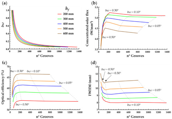 The influence of different sizes of δω on the ESFL output performance was analyzed for the most favorable combinations of hf and hl that achieved the highest concentrated solar fluxes (Figure 14a). The variation of δω changes the size of each groove/prism within the ESFL concentrator, mainly changing the size of the input (AnBn) and the output (AnDn) facets, as calculated in Equations (9) and (15). A range of δω, from 0.05° to 1°, was used for the conception of the ESFL model. Figure 15a shows the number of grooves per δω at different hf. The number of grooves drops exponentially independently of the hf with the increase in δω. A gap in the number of grooves between hf is observed at a smaller δω, while it converges closer into the same number of grooves at a larger δω.