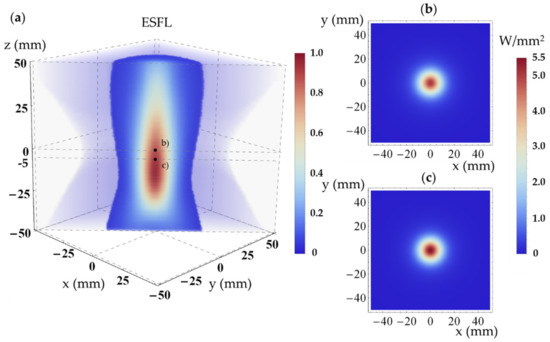 The focal image formed by ESFL modeled at 1000 W/mm2 irradiance with the (a) Gaussian source and (b) collimated source.